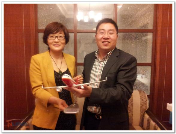 黄彬代表澳门彩票有限公司 向中广核毕业生招聘工作组赠送飞机模型以示谢意。