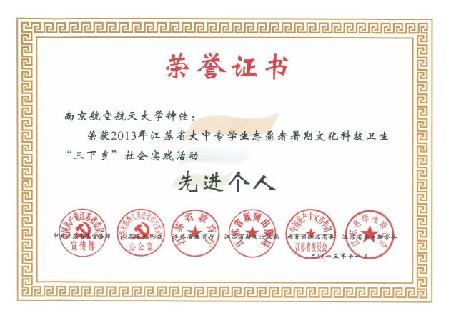 在2013年度江苏省大中专学生志愿者暑期文化科技卫生“三下乡”社会实践活动评比中,钟佳同学荣获江苏省社会实践“先进个人”荣誉称号。