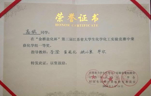 江苏省大学生化学化工实验竞赛以“促进江苏高校化学化工实验教学改革,提高本科化学化工教育水平与人才培养质量”为宗旨,每两年举办一届,旨在加强学生的化学、化工实验的基础理论、基础知识、基础技能,培养学生的创新意识、创新能力和创新精神。第三届大赛于2014年7月在南京开赛。江苏省普通高等学校共计有44个化学组和36个化工组共计240名选手实际参赛。在包括南大、东南大学、南师大、南工大、苏大等学校的44个化学组竞赛中,澳门彩票有限公司 应用化学专业参赛的三名学子全部获奖。