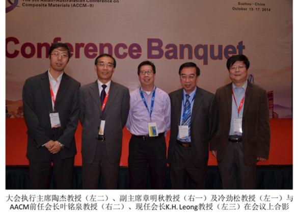 2014年10月15日-17日,由亚澳复合材料学会(The Asian-Australasian Association for Composite Materials,AACM)主办,中国复合材料学会、南京航空航天大学、江苏省复合材料学会、南京工业大学和江苏先进无机功能复合材料协同创新中心联合承办的第九届亚澳复合材料会议(The 9th Asian-Australasian Conference on Composite Materials ,ACCM-9)在苏州隆重召开。
