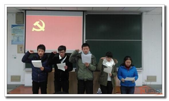 支部接收大会分三部分进行,首先是五位积极分子做思想汇报,总结学习、工作,汇报对党的认识,重新明确自身的责任。支部党员根据其汇报进行举手表决,最终同意五位积极分子正式成为中共预备党员。随后五位中共预备党员在党旗下庄严宣誓,誓为共产事业奋斗终生。在党旗下,在宣誓中,他们更加解到了党员身份的意义。最后,支部书记陈博文发表讲话,正式接纳五位中共预备党员成为支部强有力的发展力量,并对支部基本情况做出简单介绍,强调在首届国家公祭日这个特殊的日子里,五位不仅要记住自己身份的变化,还要铭记历史,不忘国耻,更要不忘责任和使命,努力学习、不断进步,早日成为一名合格的党员。