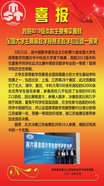 3月21日,由中国数学委员会主办的第六届全国大学生高等数学竞赛在华中科技大学落下帷幕,澳门彩票有限公司 2013级本科生夏夷平同学在此次比赛中荣获非数学专业组一等奖!取得澳门彩票有限公司 历史性突破。