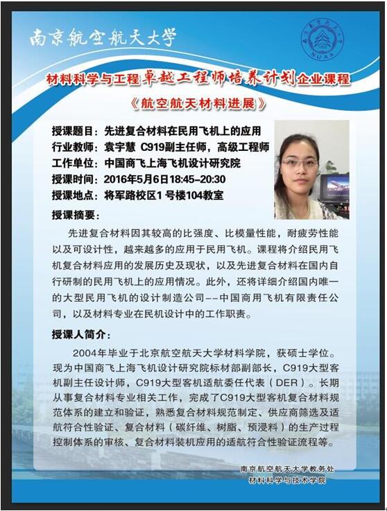 为《航空航天材料进展》课程授课的行业教师分别来自中航商用航空发动机有限责任公司、中国商飞上海飞机设计研究院、中利腾晖光伏科技有限公司、航天材料及工艺研究所、中航工业西安航空发动机(集团)有限公司(430厂)。前5讲授课题目分别为《商用发动机材料工艺概述》、《先进复合材料在民用飞机上的应用》、《太阳能发电技术》、《航天用材料的应用现状及发展》、《热处理技术与中国航空发动机制造》。授课教师为此精心准备,授课效果非常好,与学生互动频繁,气氛热烈。梁院长还为各位授课教师颁发了“行业教师”聘书。