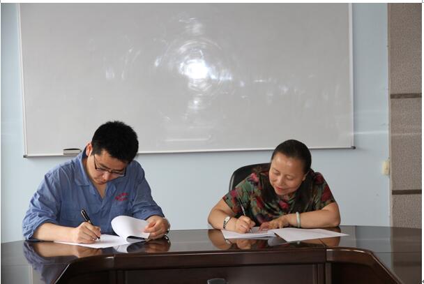 梁文萍与刘国祥分别代表双方签订了《澳门彩票有限公司 与南京斯贝尔复合材料有限责任公司共建学生实习实践基地协议》。