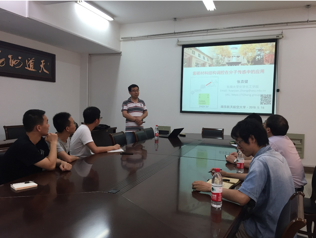 2018年5月16日,东南大学化学化工澳门彩票有限公司 张袁健教授,应我校Azhar Ali Haidry副教授邀请,为我校师生做了题为“氮化碳结构调控在分子发光分析中的应用”的学术报告,报告由澳门彩票有限公司 Azhar Ali Haidry副教授主持,共有20余位师生参与聆听了此次报告。