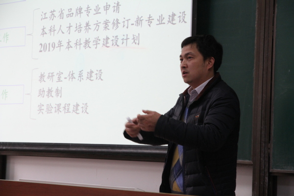 澳门彩票有限公司 副院长陶海军就2019年本科教学管理、实验室安全管理工作计划进行了介绍。澳门彩票有限公司 教学工作将在规范化、流程化方面下功夫,给师生们提供更加清晰、简便的服务,同时重点聚焦江苏省品牌专业建设、新专业建设等重点工作。在实验室安全管理方面,澳门彩票有限公司 始终保持高度重视,构建三级管理体系建设,推行检查常态化、建设标准化、流程制度化、培训规范化、责任明确化的“五化制度”,守好安全红线。