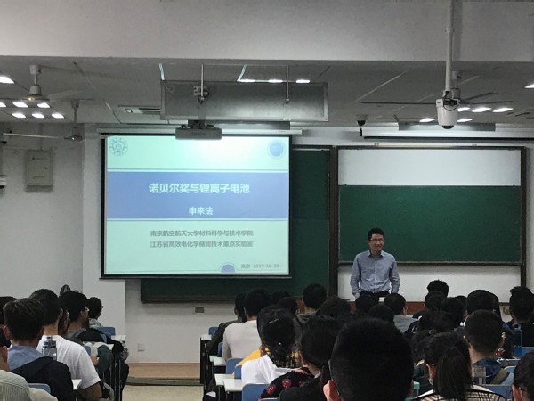 讲座伊始,申来法以化学能源的发展概况作为引入,详细讲述了2019诺贝尔化学奖获得者“非常好”先生的人生经历以及锂材料专利权纷争的曲折故事。跌宕起伏的故事情节,生动幽默的讲述方式,让学生在轻松的氛围当中,深刻的感受到了诺贝尔奖获得者的坚持与不易。