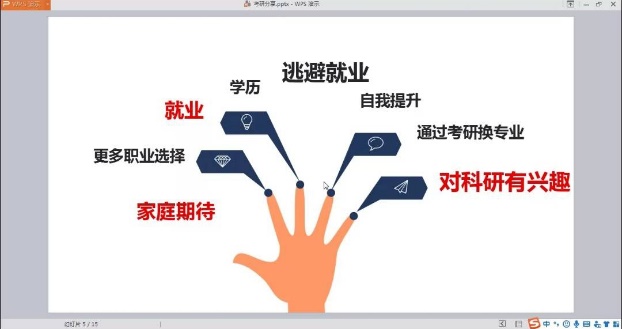 针对保研,黎文英就澳门彩票有限公司 2019年度的保研流程分析了学业成绩与综合排名的关联度,强调了学习成绩的重要性,并嘱咐同学们在疫情期间不放松网课学习;针对考研,黎文英就心态调整和具体规划两方面给出建议,并以制定计划为例,分别从学习初期、巩固、冲刺三个阶段做出了详细的规划指导,启发同学们夯实基础,及时巩固,贵在坚持。