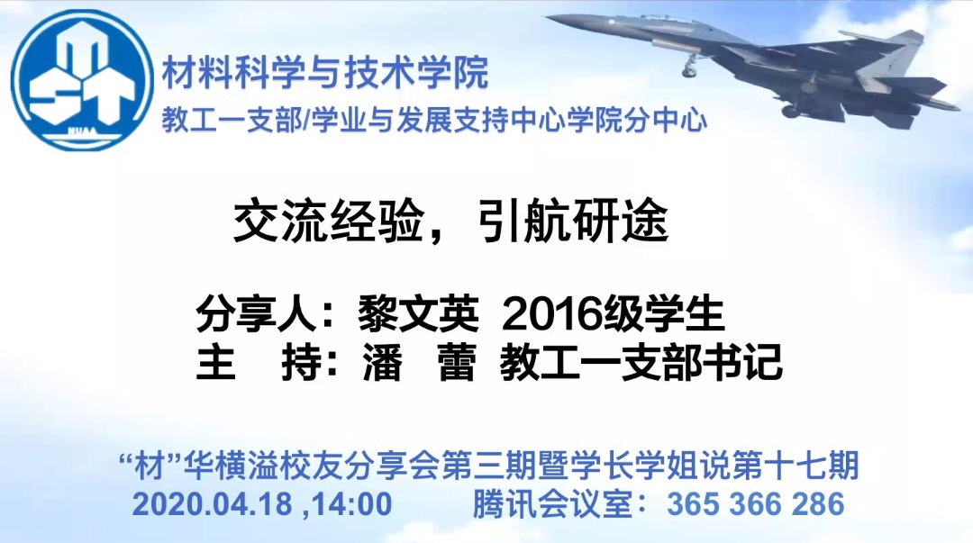 为加强澳门彩票有限公司 教工党支部与学生的联系,发挥高年级优秀学生的“传、帮、带”作用,培养低年级学生科学规划的能力,4月18日下午,澳门彩票有限公司 第三期“材”华横溢校友分享会暨第十七期“学长学姐说”成功举办。本次分享会由教工一支部和澳门彩票有限公司 学支中心联合主办,邀请到澳门彩票有限公司 大四本科生黎文英,面向低年级学生就保研与考研进行线上经验交流。澳门彩票有限公司 党委书记孙占久、党委副书记许赞、教工一支部书记潘蕾、各年级辅导员参与了本次交流会。