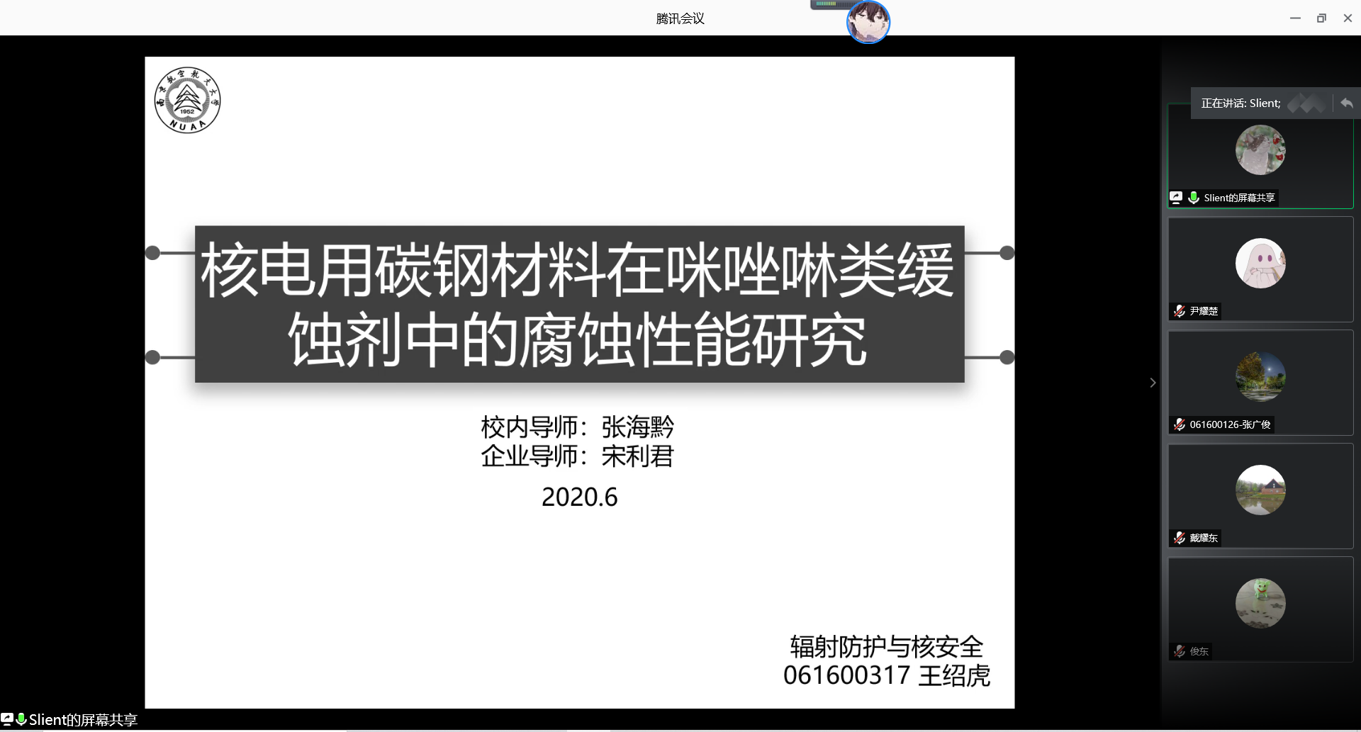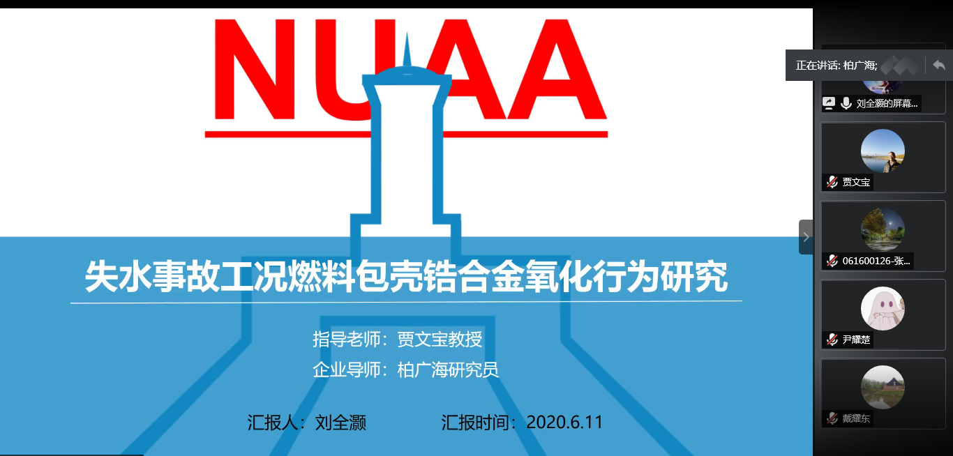 6月11日,中广核—南航校企协同育人平台首期校企毕设项目答辩在腾讯会议通过线上方式顺利开展。中广核苏州热工研究院有限公司人力资源部副主任徐韧,电站寿命管理技术中心柏广海、范敏郁,校企项目负责人顾鑫4位专家,澳门彩票有限公司 院长助理、核科学与技术系主任常树全,教工三支部党支部书记丰俊东,核科学与技术系贾文宝、戴耀东等5位教师参加了此次校企毕设项目答辩。