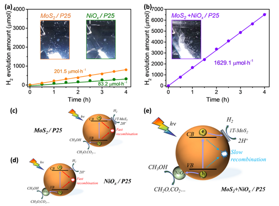 为了达到光生电子空穴对的有效分离,将本工作中合成的纳米级1T硫化钼单层和氧化镍纳米颗粒混合并分散在二氧化钛表面制备双助催化剂混合体系。单助催化剂和双助催化剂的催化析氢活性分别在图3a和3b中显示。如所观察,双助催化剂体系比单助催化剂体系具有非常显著的光催化析氢活性增强。从插图中可以更直接地观察到双助催化剂体系有更强烈的氢气冒出(图3b)。这种双助催化剂体系的光催化氢气析出速率可高达1629.1umol∙h-1,接近Pt的2196.8umol∙h-1,而且显著高于单助催化剂氧化镍纳米颗粒和1T硫化钼单层的83.5和201.5umol∙h-1。双助催化剂提高光生电子空穴对的分离机理图如3c-3e所示。光生电子空穴对的分离不仅由于硫化钼和二氧化钛之间牢固的界面接触使光生电子迅速地从二氧化钛转移到纳米1T相硫化钼,同时通过氧化镍快速地捕获了光生空穴,使光生电子空穴迅速的被捕获消耗,降低二者的复合几率。而单助催化剂硫化钼或着氧化镍,光生电子或空穴由于无法被快速捕获而在二氧化钛位发生累积,高浓度的残余电子空穴对驱动了光生电子和空穴的复合,导致光催化析氢活性较低。总体而言,纳米级1T硫化钼单层与二氧化钛之间更紧密的界面接触以及氧化镍捕获光生空穴的协同作用促进了光生电子和空穴的分离,使得纳米级1T硫化钼单层获得了接近铂/二氧化钛的光催化析氢性能。该双助催化剂对提高光催化析氢活性的有效性,将能够进一步应用于其他光催化体系中。
