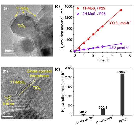 图2:1T-MoS2负载在P25 TiO2上的(a)高分辨透射电子显微图像图像和(b)局部放大图像;(c-d)光催化析氢活性之间的比较。