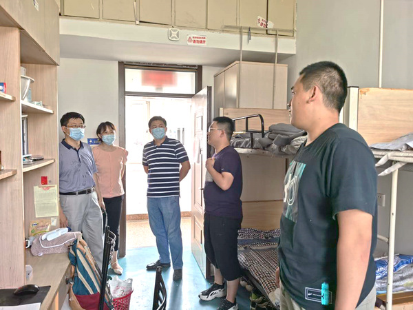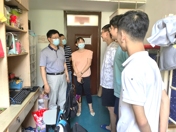 截至8月16日晚,澳门彩票有限公司 本科年级返校人数已达663人。为了深入了解返校同学们的生活状况,切实解决同学们所遇到的实际问题,加强疫情防控期间学生的安全稳定管理,8月16日下午,院长张校刚、党委副书记许赞、副院长陶海军以及各年级辅导员一同走进学生宿舍,慰问时隔半年又重新返校的同学们。