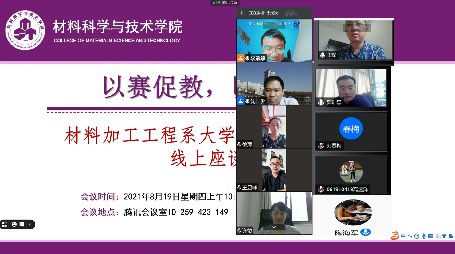 为进一步激发青年教师指导学生科创项目的积极性,提高科创指导能力,8月19日,澳门彩票有限公司 材料加工工程系组织开展“以赛促教,以赛促改”学生科创项目线上交流活动。校团委副书记丁琛,澳门彩票有限公司 副院长陶海军、党委副书记许赞、团委书记徐萍、材料加工工程系主任郭训忠以及材料加工工程系30余名青年教师和参赛学生代表参加了此次座谈会。