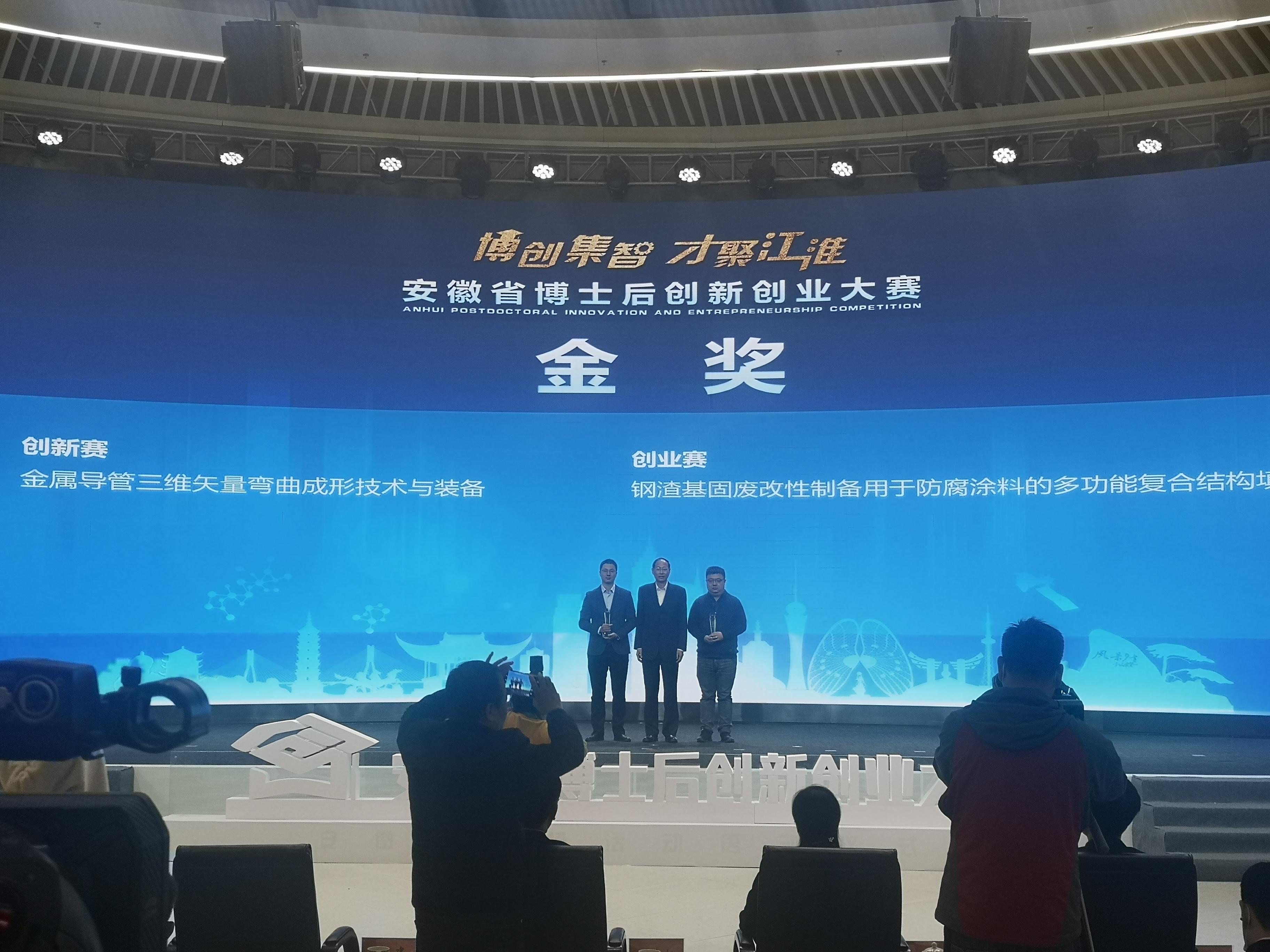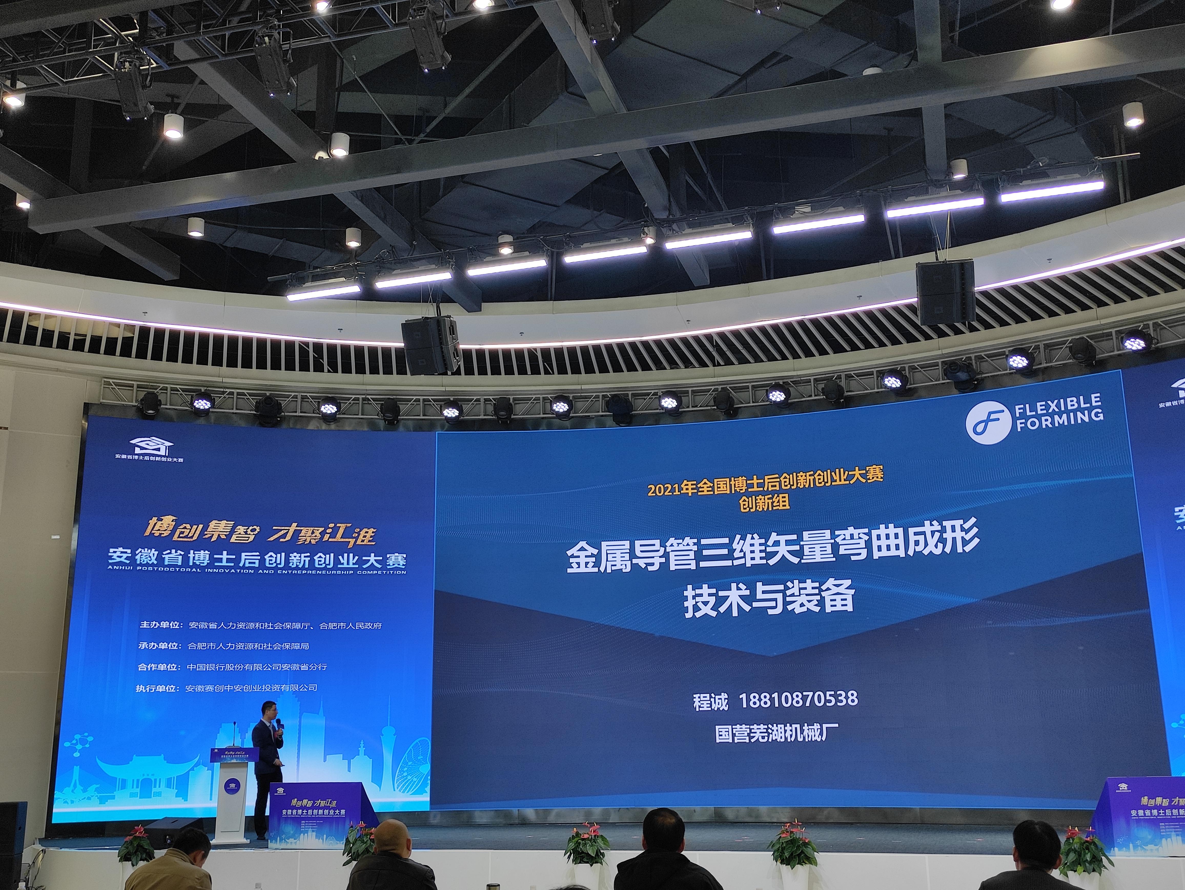 此次全国博士后创新创业大赛,是人社部首次举办的全国性博士后创新创业赛事。安徽赛区共有43个项目入围决赛,设金奖2名、银奖4名、铜奖10名。我院与中国人民解放军第5720厂联合培养博士后程诚的“金属导管三维矢量弯曲成形技术与装备”,以第一名的好成绩获得创新组金奖。