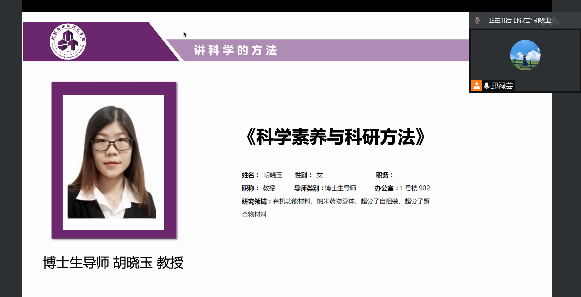 首先,胡晓玉教授以一张17年前的老照片说起,分享了自己自本科以来的科研经历,讲述了自己如何从生物专业跨到化学专业,以自身经历告诉同学们跨专业没有那么可怕。以娓娓道来的方式提醒同学们要正视困难,积极应对,锤炼心理素质,过渡适应期。