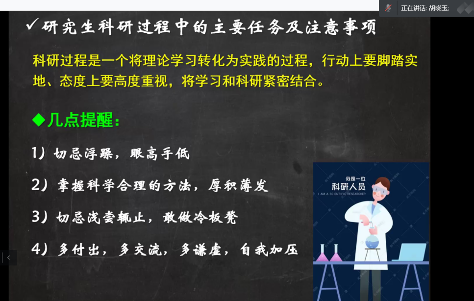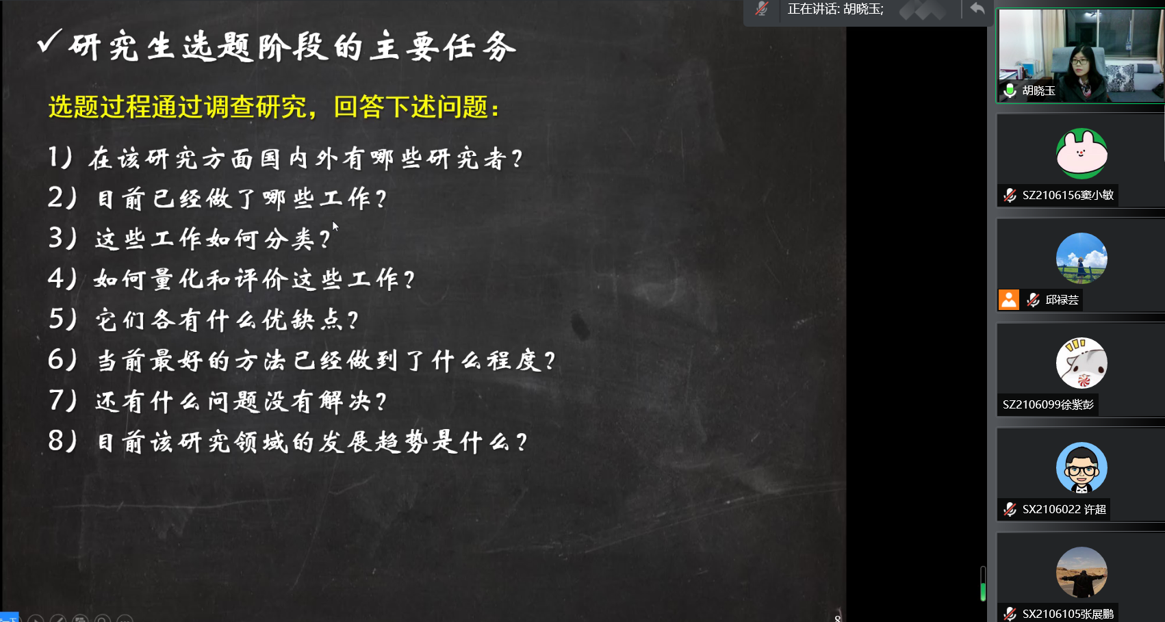 选题确定后就开始了漫漫科研路的“苦练”。胡晓玉教授强调,科研过程是一个将理论学习转化为实践的过程,行动上要脚踏实地,态度上要高度重视,将学习和科研紧密结合。并且告诫同学们要严守学术道德底线,抵制学术不端行为。