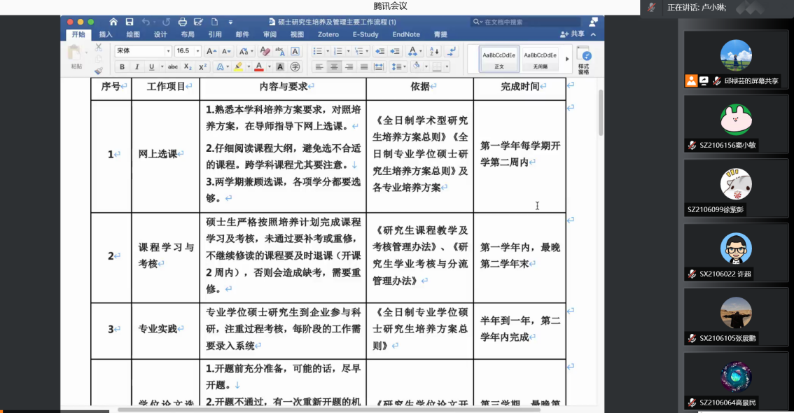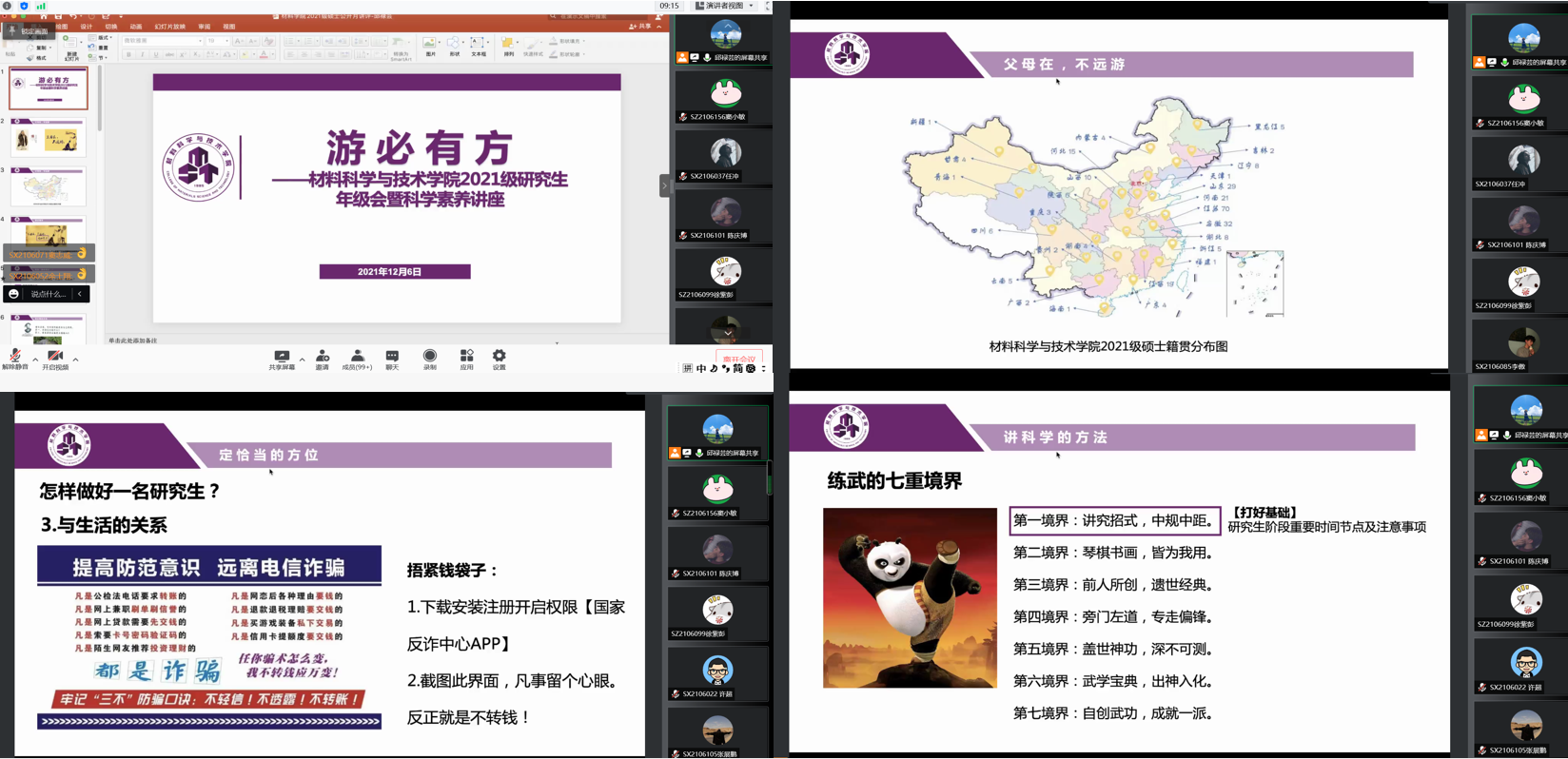 为帮助2021级研究生适应新阶段的学习生活,澳门彩票有限公司 紧密结合研究生特点及研究生培养需求,综合考虑疫情防控要求,于2021年12月6日,以线上会议的方式开展2021级研究生公开月讲评。会议由2021级硕士辅导员邱禄芸主讲,研究生教务员卢小琳、博士生导师胡晓玉出席,2021级全体研究生参加。