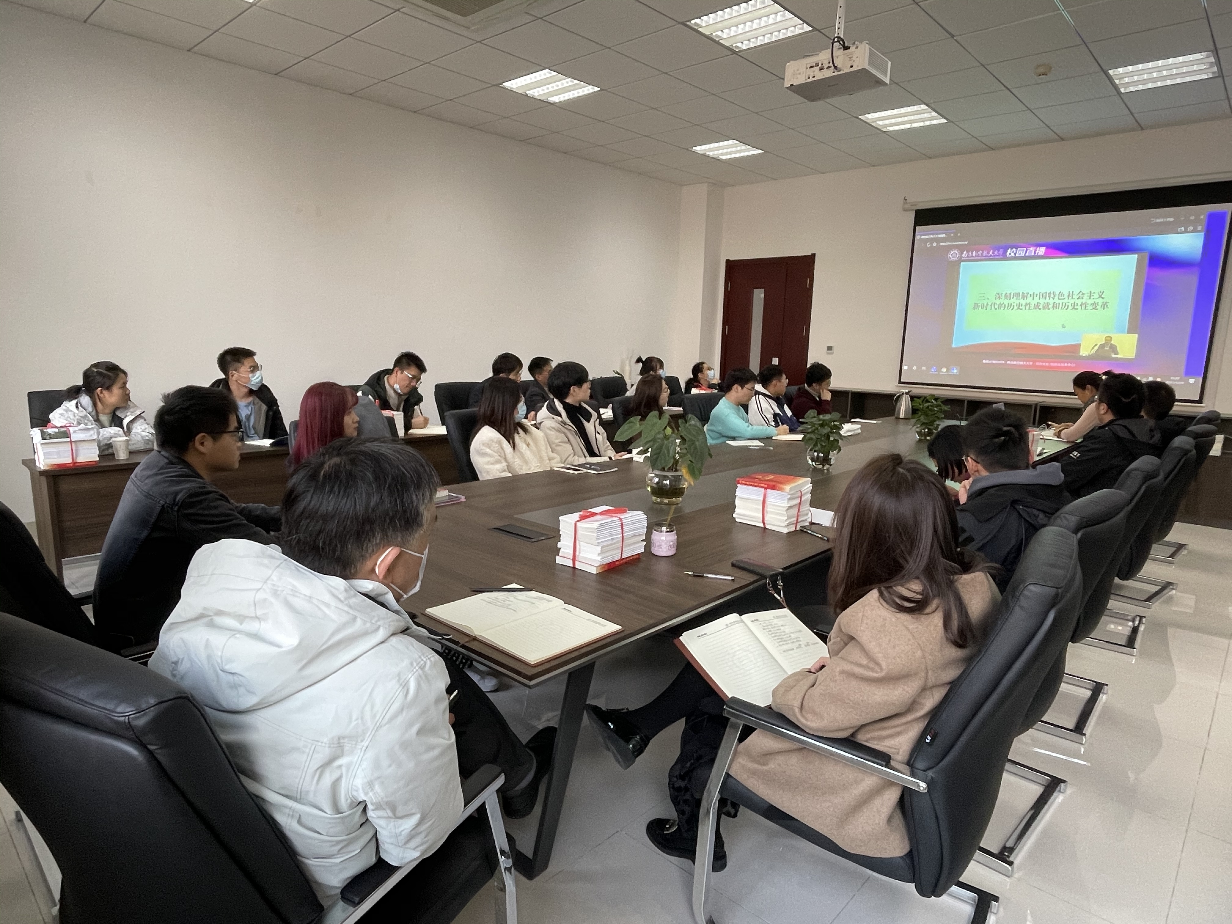会议室师生认真收听,全神贯注,被丰富的报告深深吸引,现场反响热烈。师生纷纷表示,对党的十九届六中全会内容理解更加深刻、精神领会更加透彻。
