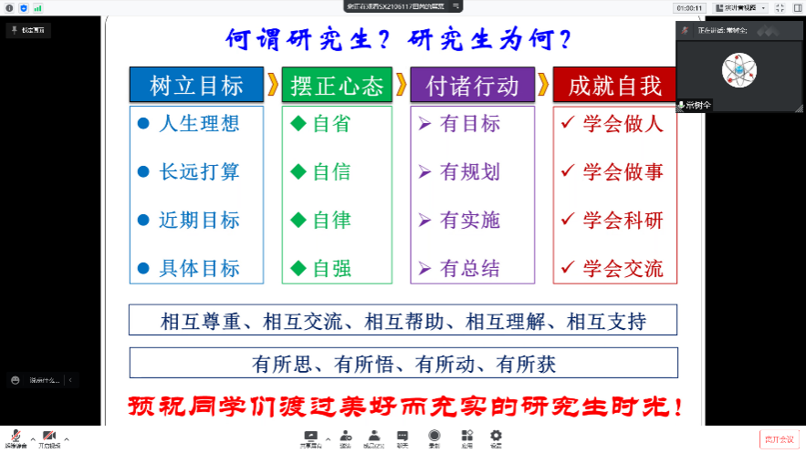 最后,同学们纷纷开麦、踊跃提问,“大家一起聊未来”——“有读博的打算的话,硕士期间要做好什么准备?”“中物院‘大神’云集,如何脱颖而出?”“咱们系的女生求职跟男生有区别吗?”“如何才能做出科学高效的实验计划?”……老师和师兄师姐们热心耐心地为同学们解惑,在良好的沟通交流中,解决了同学们在学习、科研、求职等方面的困扰。