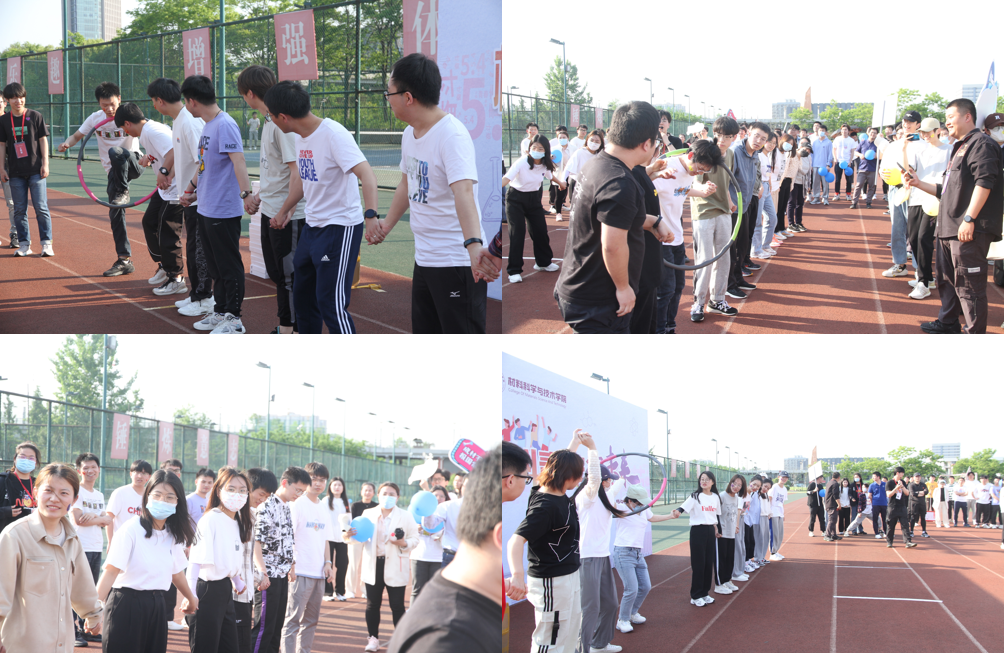 在“智传呼啦圈”中,一环一环,串起的是导学之心。呼啦圈在手拉手形成的长龙中快速传递,师生们低头、抬手,些许“扭曲”的姿势,引发的阵阵笑声,让欢乐洋溢在赛场之中。