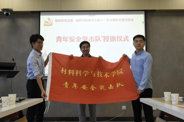 首先,国资处处长孙占久传达了成立“实验室安全督导团”的工作要求,鼓励师生联动自查自检自纠,最大程度降低实验室安全风险,牢固树立“预防为主,安全为先”的安全意识。澳门彩票有限公司 积极响应学校号召,聘请国资处、澳门彩票有限公司 安全员、辅导员在内的5位老师担任“安全指导员”,在12个研究生纵向党支部中选树了一批安全意识强、积极主动、认真负责的党员同志,担任“安全吹哨人”,共同组建了澳门彩票有限公司 “青年安全突击队”。孙占久为“青年安全突击队”授旗,石勇为“安全指导员”“安全吹哨人”颁发聘书。