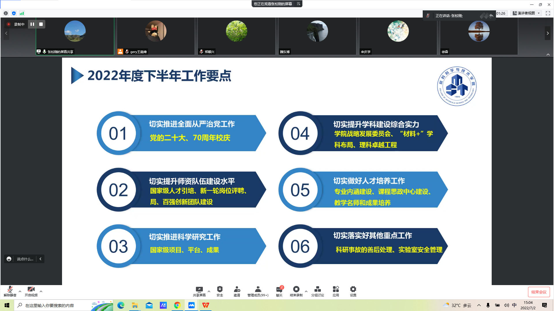 张校刚就澳门彩票有限公司 上半年工作情况、暑期工作计划及下半年工作要点进行介绍。总结了2022年上半年澳门彩票有限公司 在党建、人才培养、学科建设、师资队伍建设、科学研究、安全管理等方面推进的工作和取得的成效;明确了暑期对西区楼改造、东区楼维修等重要工作的部署;指明了下半年全院要在落实上下功夫,紧扣建设发展关键指标,推动工作落地见效。