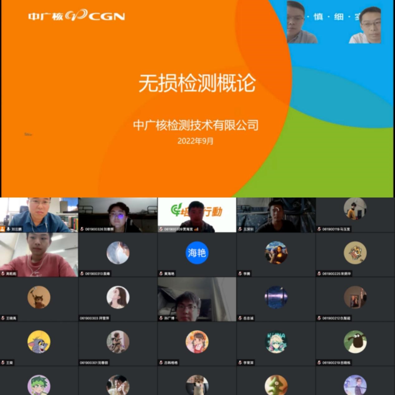 9月1日,由刘云鹏老师带队,中广核检测技术有限公司的张国亚老师、华雄飞老师带领同学们完成了“线上”云实习。在这个过程中,同学们学习了有“核安全卫士”、给核电体检的“医生”称号的核电无损检测技术,包括射线检测RT、超声波检测UT、涡流检测ET、渗透检测PT、目视检测VOT、磁粉检测MT、泄露检测LT等七大方法;同时,视频参观了中广核检测技术有限公司厂房,包括水下自动X射线无损检测设备、超声无损检测设备等检测装置,核电三大部件、核电稳压器、华龙一号蒸发器、反应堆压力容器顶盖模拟体等反应堆核心部件。学习参观之后,实习单位老师认真解答了同学们的各类问题。