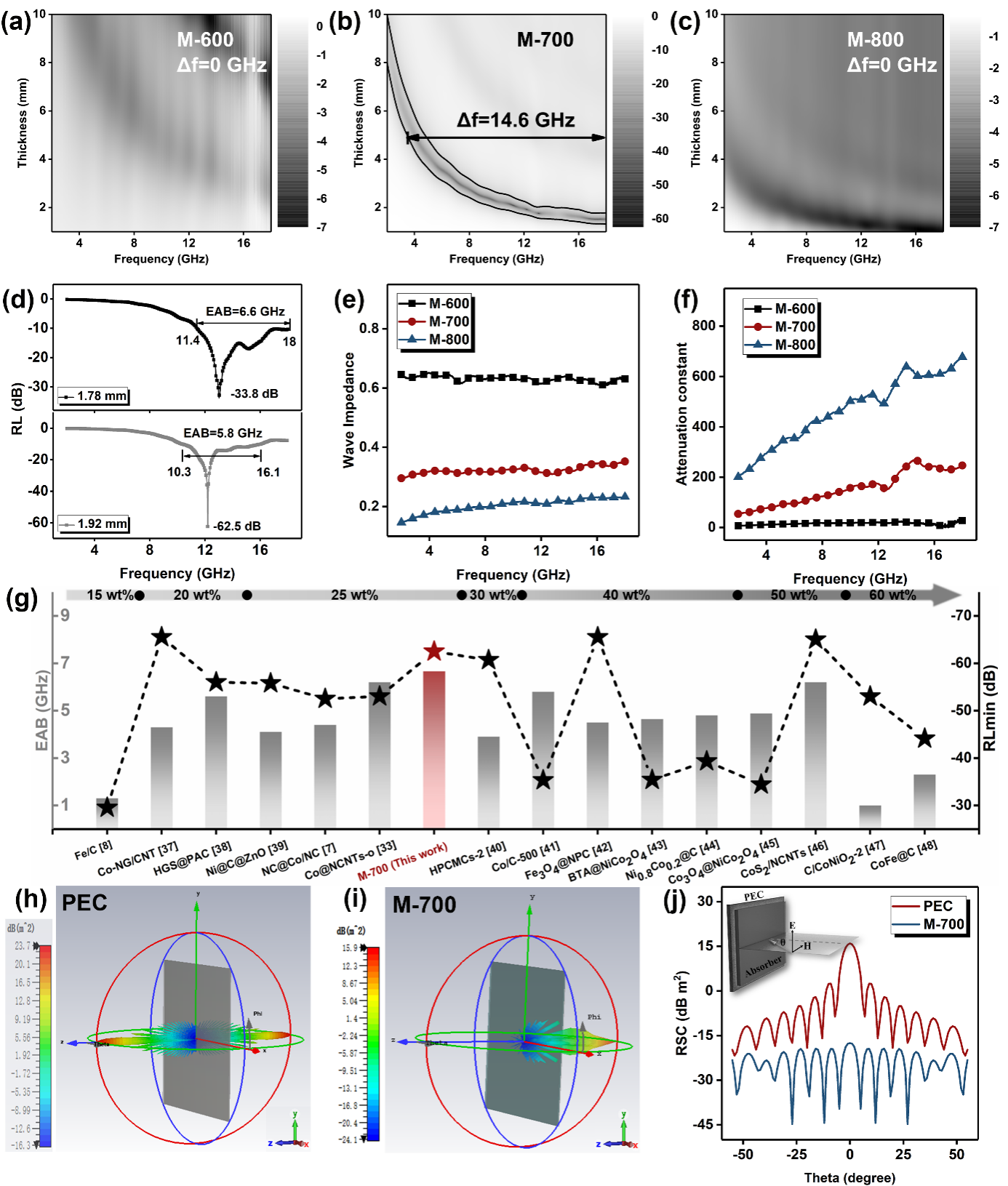 图2. 热处理温度对吸波性能影响、同类吸波剂的性能对比以及RCS仿真模拟