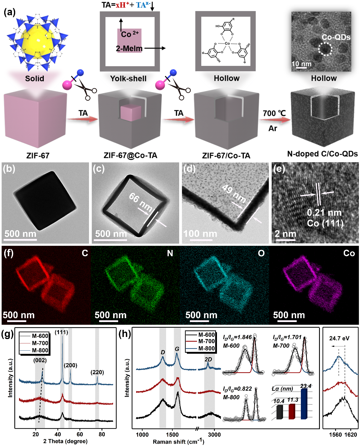 基于团队前期的研究成果(Small Methods, 2022, 6, 2200429;10.1002/smtd.202200429),ZIF-67的Co-N配位键能被硝酸盐水解得到的质子轻易裁断。因此,这里使用更直接的质子源对ZIF-67进行自模板保护性裁剪,从而构筑可控空腔。然后,灵活热力学调节工艺(600℃-800℃)实现有机C→石墨→石墨烯以及Co2+→Co单质的物相转化,Raman中的峰位移的ID/IG值变化初步揭示从无序至有序的碳原子模型。
