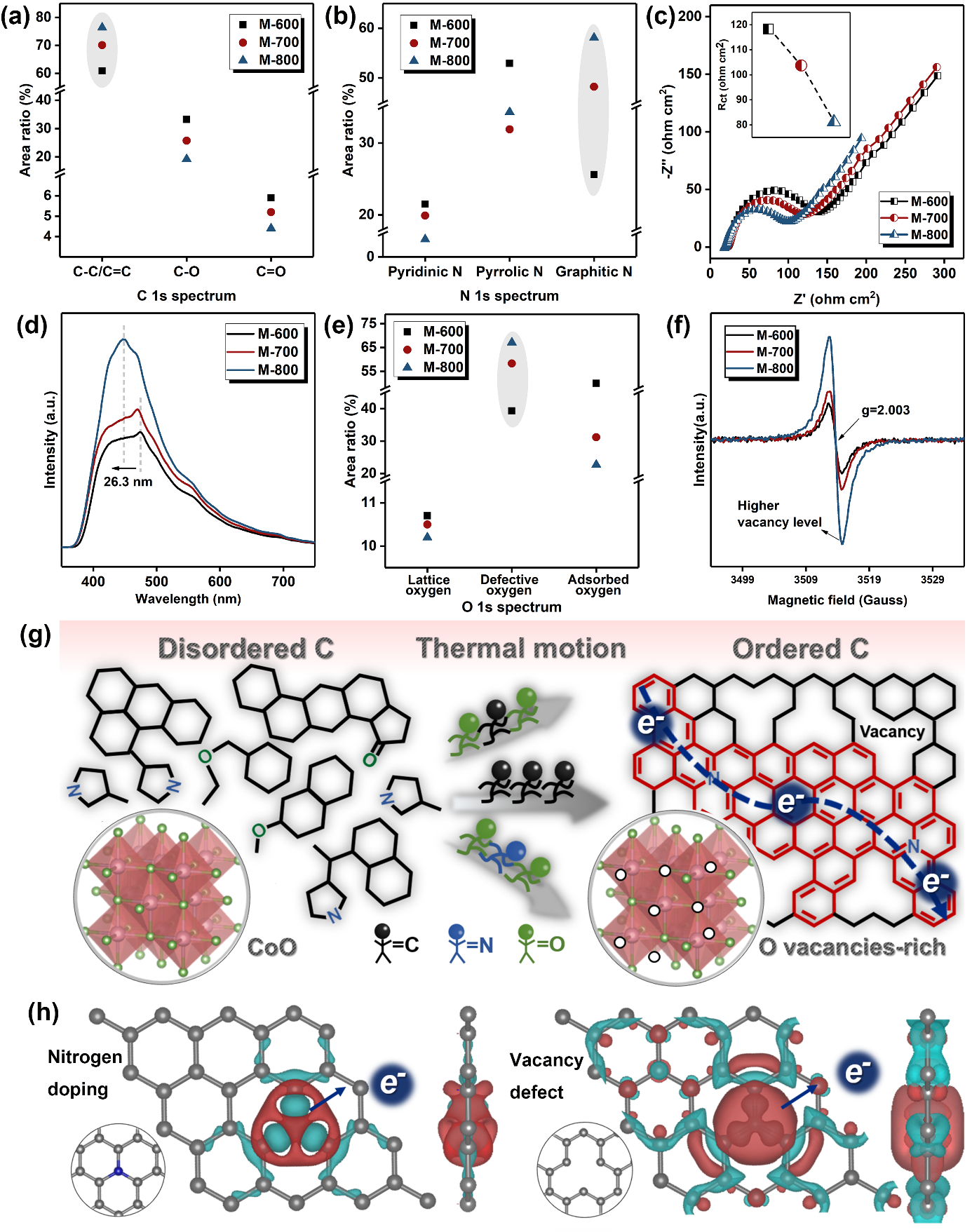 图4.电荷转移特性表征、空位缺陷表征、分子热运动模型和DFT计算