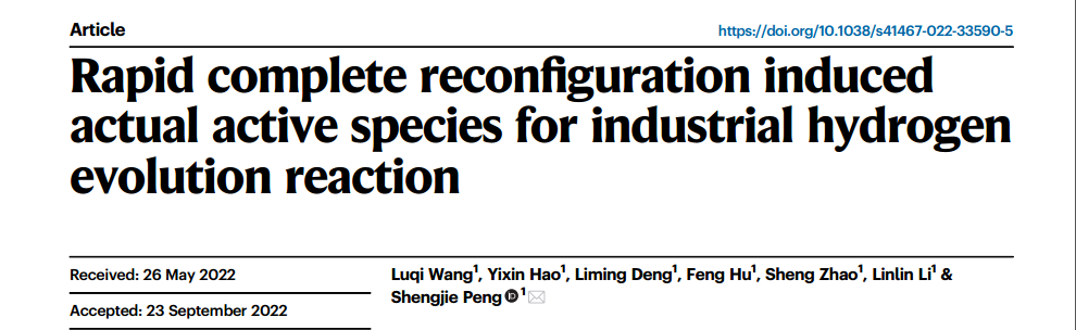 Luqi Wang, Yixin Hao, Liming Deng, Feng Hu, Sheng Zhao, Linlin Li, Shengjie Peng*, Rapid complete reconfiguration induced actual active species for industrial hydrogen evolution reaction, Nature Communications, 2022, 13, 5785.