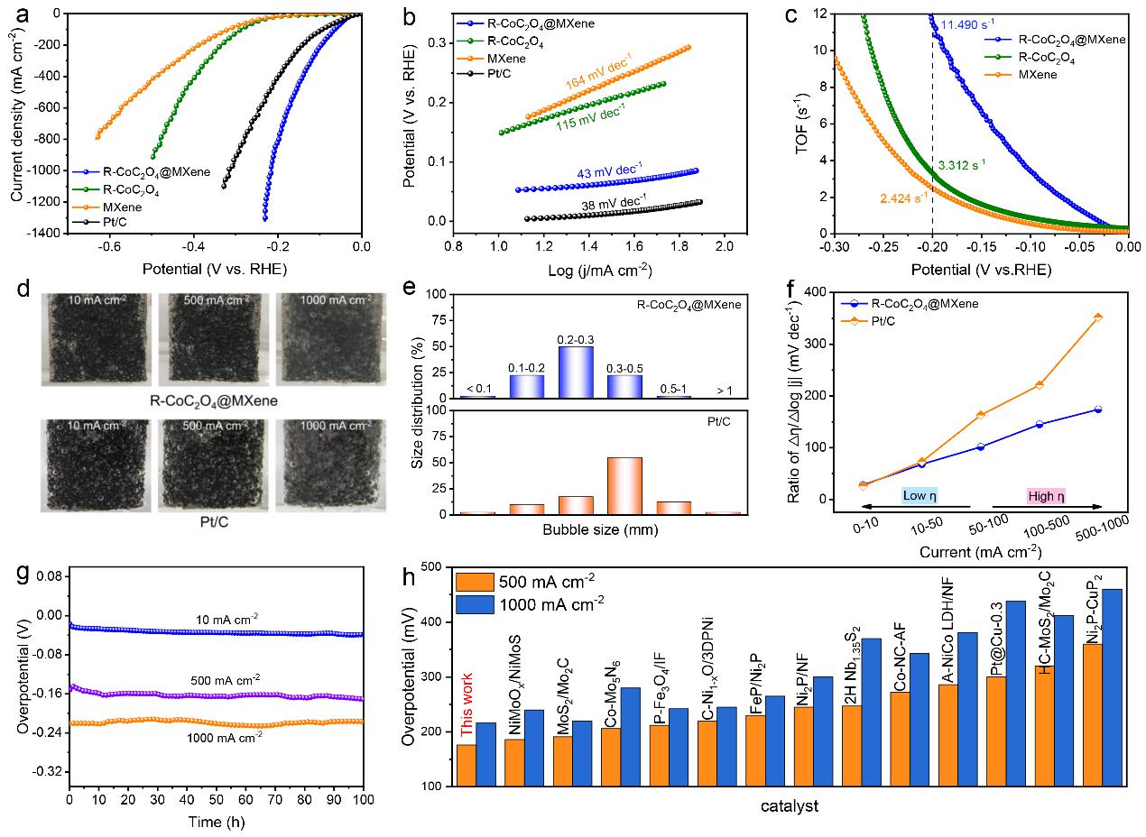 电化学测试表明,重构后的R-CoC2O4@MXene在10 mA cm-2电流密度下的过电位仅仅为28 mV。特别是,在500和1000 mA cm-2的大电流密度下R-CoC2O4@MXene催化剂分被呈现出157和216 mV较小的过电位,这远远优于商用Pt/C。TOF和大电流密度下的性能分析进一步核实了其优越的HER本征活性。此外,R-CoC2O4@MXene在10、500和1000 mA cm-2的电流密度下可以保持100 h的稳定性几乎没有衰减,这表明该催化剂具有潜在的工业应用价值。