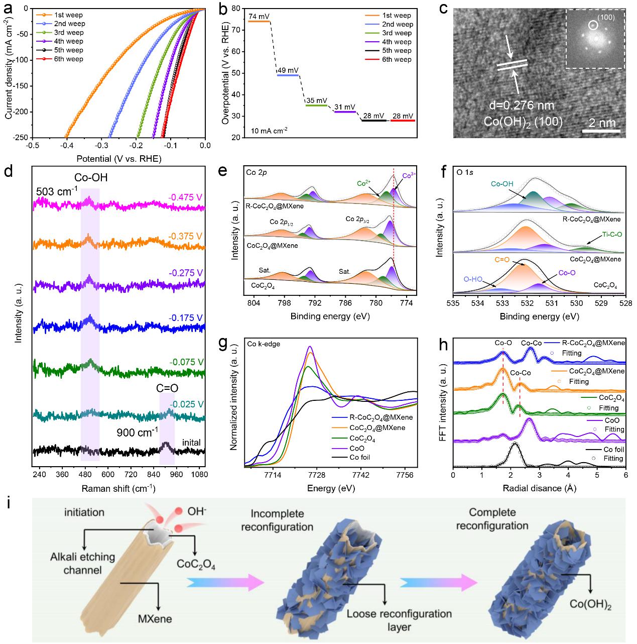 采用界面诱导自组装策略合成具有空心纳米管结构的CoC2O4@MXene预催化剂。管状结构不仅呈现出较高的比表面积,而且还具有丰富的扩散通道,以激活电解质的扩散维度并解除质量运输的限制。甚至电解质可以进入CoC2O4@MXene基体的内部,这提供了一个更大的电解质-电催化剂界面。此外,高度亲水的MXene的引入大大改善了水的吸附和电极的润湿性,这种独特的结构为自发的快速完全重构提供了可行性。