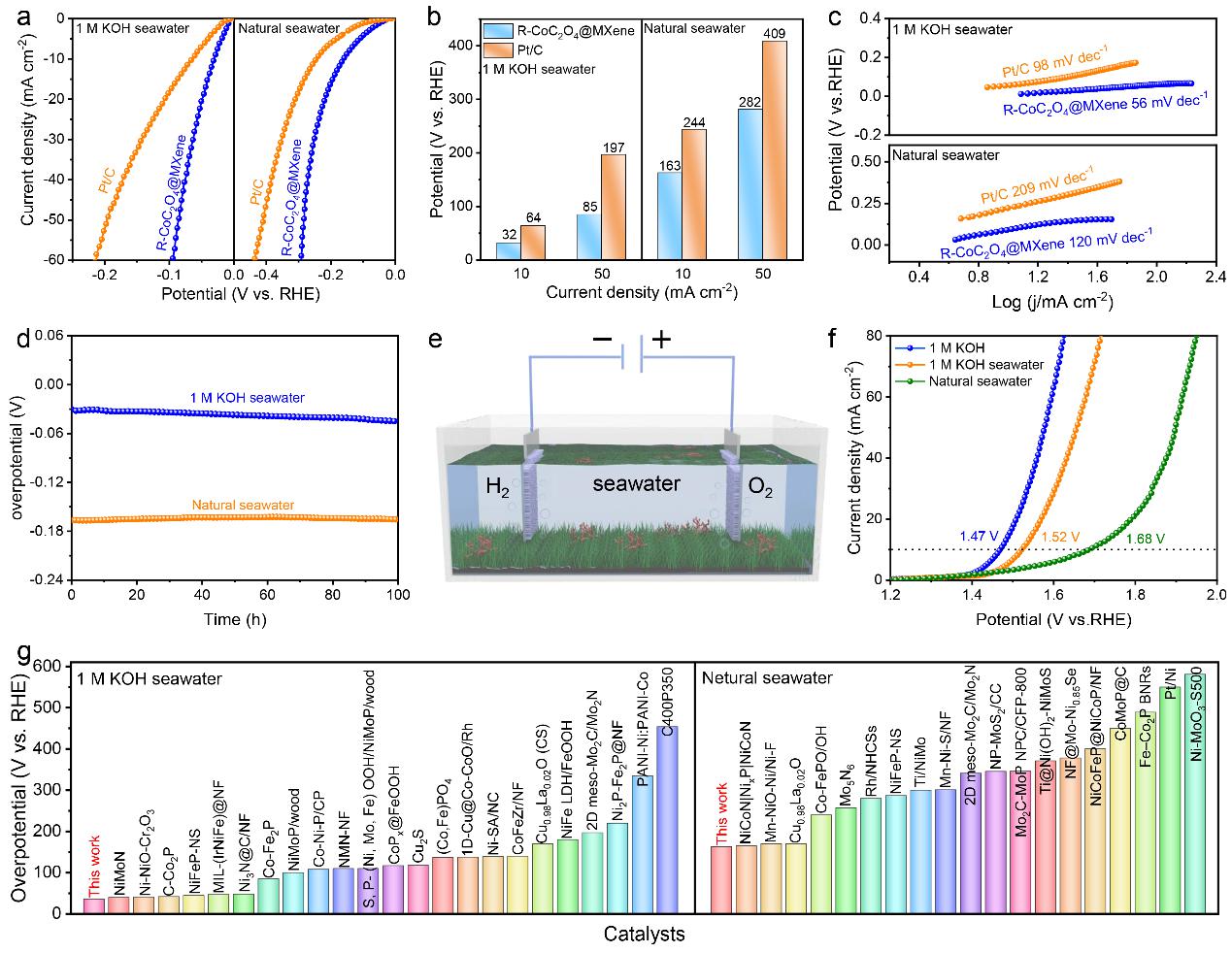 海水电解由于其丰富性和低成本而成为传统淡水电解的一个有前途的替代方案。因此,有必要评估催化剂在使用海水作为电解质时的适用性。R-CoC2O4@MXene的电催化HER活性在1 M KOH海水和天然海水中分别被测量。在1 M KOH海水和天然海水中,R-CoC2O4@MXene在10 mA cm-1电流密度下分别表现出32和163 mV的过电位,这显著优于商业Pt/C(64和244 mV)。值得注意的是,R-CoC2O4@MXene在海水中呈现出长达100 h的HER稳定性。这些结果表明,R-CoC2O4@MXene催化剂在海水作为电解质时也同样表现出色的催化活性和稳定性。