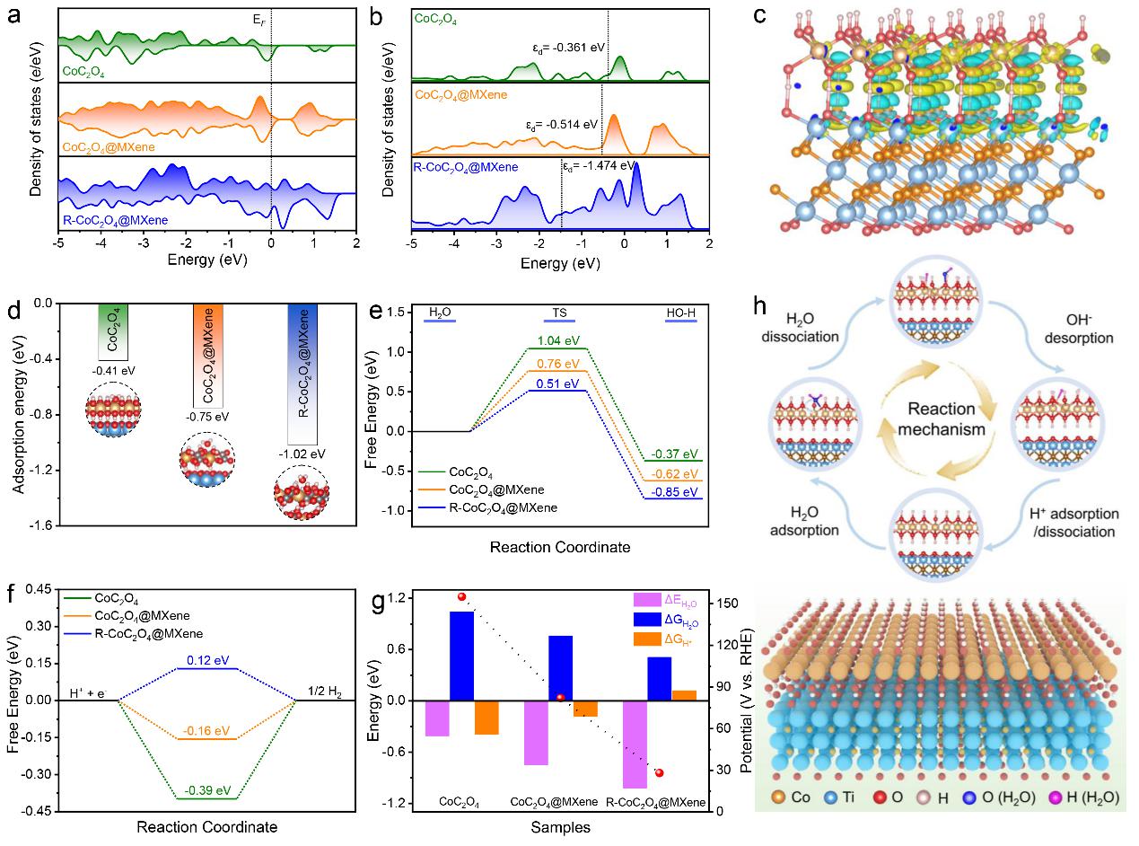 为了阐明R-CoC2O4@MXene的电子结构与优秀的HER催化活性之间的关系,对结构模型进行了密度泛函理论(DFT)计算。富缺陷的低价态Co位点展现出被优化的费米能级(Fermi level)和显著下降的D带中心(D-band center)。差分电荷密度也揭示了R-CoC2O4@MXene中的电荷重新分布。这种电荷重新分布的行为可以优化反应中间体的吸收能量,从而提高催化活性。低价态的不饱和Co位点上有利的水吸附(ΔEH2O)和水解离(ΔGH2O)自由能有效促进了Volmer步骤的进行。此外,接近于热中值的氢吸附自由能(ΔGH*)表明在低价态不饱和的Co位点上有合适的H*吸附和H2解吸的反应能垒。总的来说,具有不饱和配位金属Co位点的R-CoC2O4@MXene优化了HER反应的吉布斯自由能和催化剂的电子结构,从而改善了催化性能。
