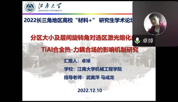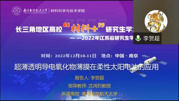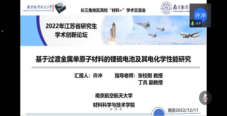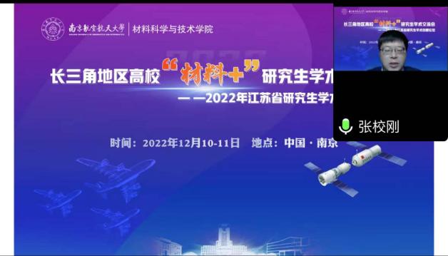 12月10-11日,由江苏省教育厅工学 3 类教指委主办,南航澳门彩票有限公司 承办的长三角地区高校“材料+”研究生学术交流会暨2022年江苏省研究生学术创新论坛活动顺利举办。来自北京大学、浙江大学、北京航空航天大学、上海理工大学、东南大学、西北工业大学、南京理工大学、中国科澳门彩票有限公司 等十几所高校的40余名学生通过线上的形式进行学术成果交流与分享,百余名师生聆听报告并参加讨论。