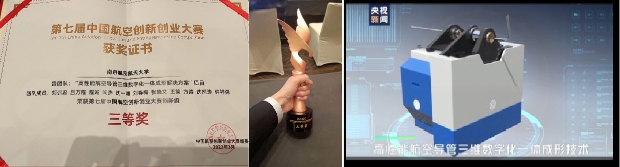 澳门彩票有限公司 柔性成形技术及装备团队项目《高性能航空导管三维数字化一体成形解决方案》在2022年的复赛中成功脱颖而出,入选全国十五强,同时代表南航参与到这次的全国总决赛中。经过激烈的角逐,澳门彩票有限公司 柔性成形技术及装备团队荣获第七届中国航空创新创业大赛全国总决赛创新组三等奖,并受到央视新闻的重点报道!
