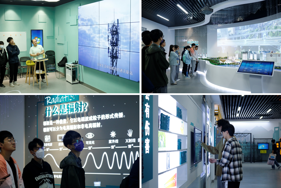 在核辐射云科普馆的多功能厅内,来自江苏省核与辐射安全监督管理中心的专家蒋若澄老师通过讲述伦琴发现辐射的有趣故事,缓缓拉开核与辐射知识课堂的帷幕。核辐社云科普馆共四个区域,分别设有沙盘、魔法墙、X光室等体验设施,以“互动+讲解”的形式科普核与辐射相关知识。同学们跟随着蒋老师的步伐进行探索,通过沙盘上林立的楼栋模型、触碰就会发光的辐射魔法墙,了解到辐射无处不在;通过可触摸屏上的内容点读和老师的详细解释,了解到辐射的危害;通过近距离观察反应堆安全壳、涡轮与发电机等模型,了解到辐射如何防范;通过可以进行模拟拍摄的X光室,了解到核技术可以造福人类。