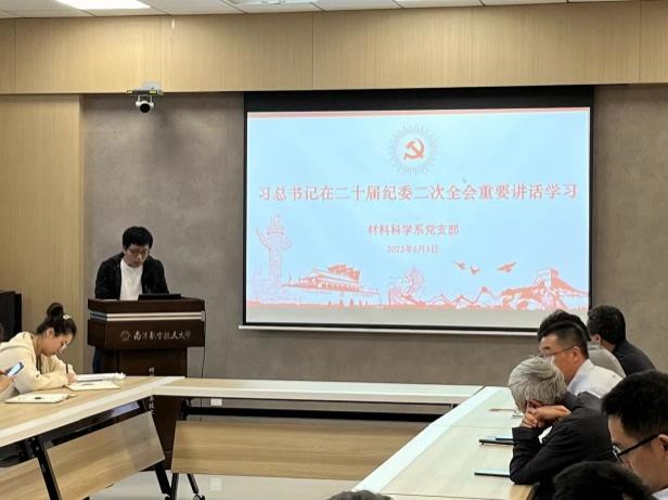 6月5日,材料科学系教工党支部联合研究生M-best电化学储能党支部深入学习贯彻习近平新时代中国特色社会主义思想和党的二十大精神。学习活动还邀请了院机关党支部党员代表参加,会议由支部书记刘劲松主持。