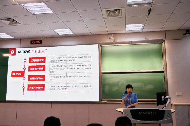 徐萍从“什么是团”切入,叙述共青团的性质与使命,鼓励新生用实际行动践行“请党放心,强国有我”的青春誓言。随后,从“以思想引领洗涤灵魂”“以组织建设强健根骨”“以科技创新放飞梦想”“以社会实践开拓眼界”“以志愿服务回馈社会”“以校园文化展示风采”六大方面介绍共青团为广大青年提供的德智体美劳全面发展平台。最后,以“总书记的青年观”为题讲授主题团课,希望所有新生团员“点亮青春理想,激昂奋斗旋律,澎湃创新动力,淬炼斗争精神”,做有理想、敢担当、能吃苦、肯奋斗的合格团员。