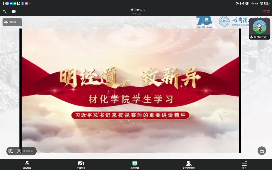 首先,参会人员共同学习习近平总书记在哈尔滨工程大学考察时的重要讲话精神。哈尔滨工程大学材料科学与化学工程澳门彩票有限公司 李佳明分享道:“作为国防七子,我们要践行军工精神,把忠诚刻进基因、融入血脉、化作行动,紧贴强国强军需要,积极担当作为,为实现强军梦贡献自己的力量。”