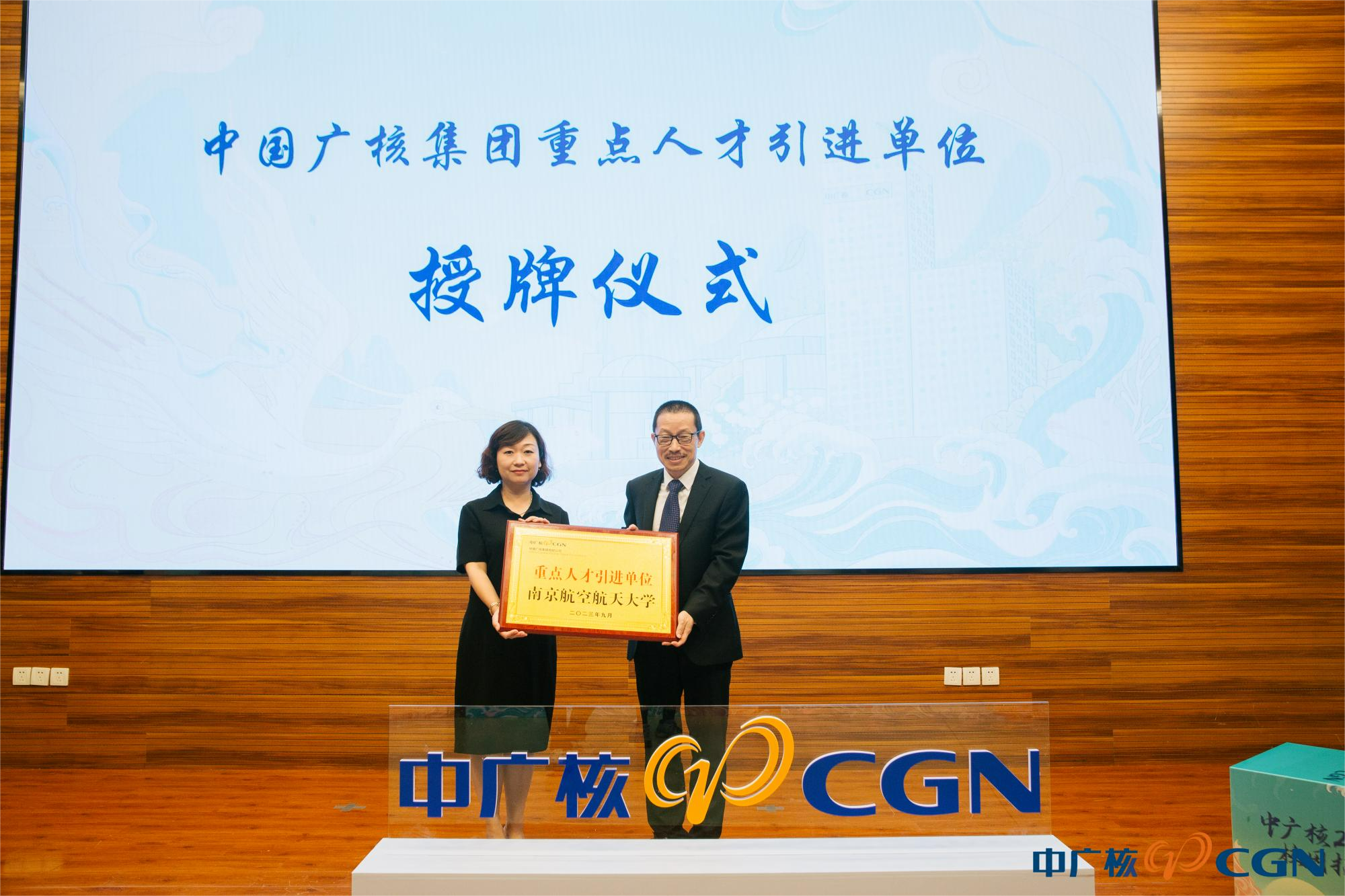 中广核授予我校“重点人才引进单位”称号,现场校企双方领导举行了授牌仪式。
