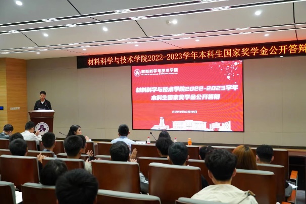 为充分发挥榜样育人的作用,激励更多同学见贤思齐、矢志奋斗,10月12日,澳门彩票有限公司 2022-2023学年本科生国家奖学金公开答辩在东区材料楼B501报告厅召开,澳门彩票有限公司 党委副书记庄晓舒、材料加工工程系系主任林开杰、核科学与技术系系主任刘云鹏、应用化学系系副主任刘初阳、材料科学系系副主任丁兵和学生代表共同担任评委。100余名2023级本科生到场学习观摩。