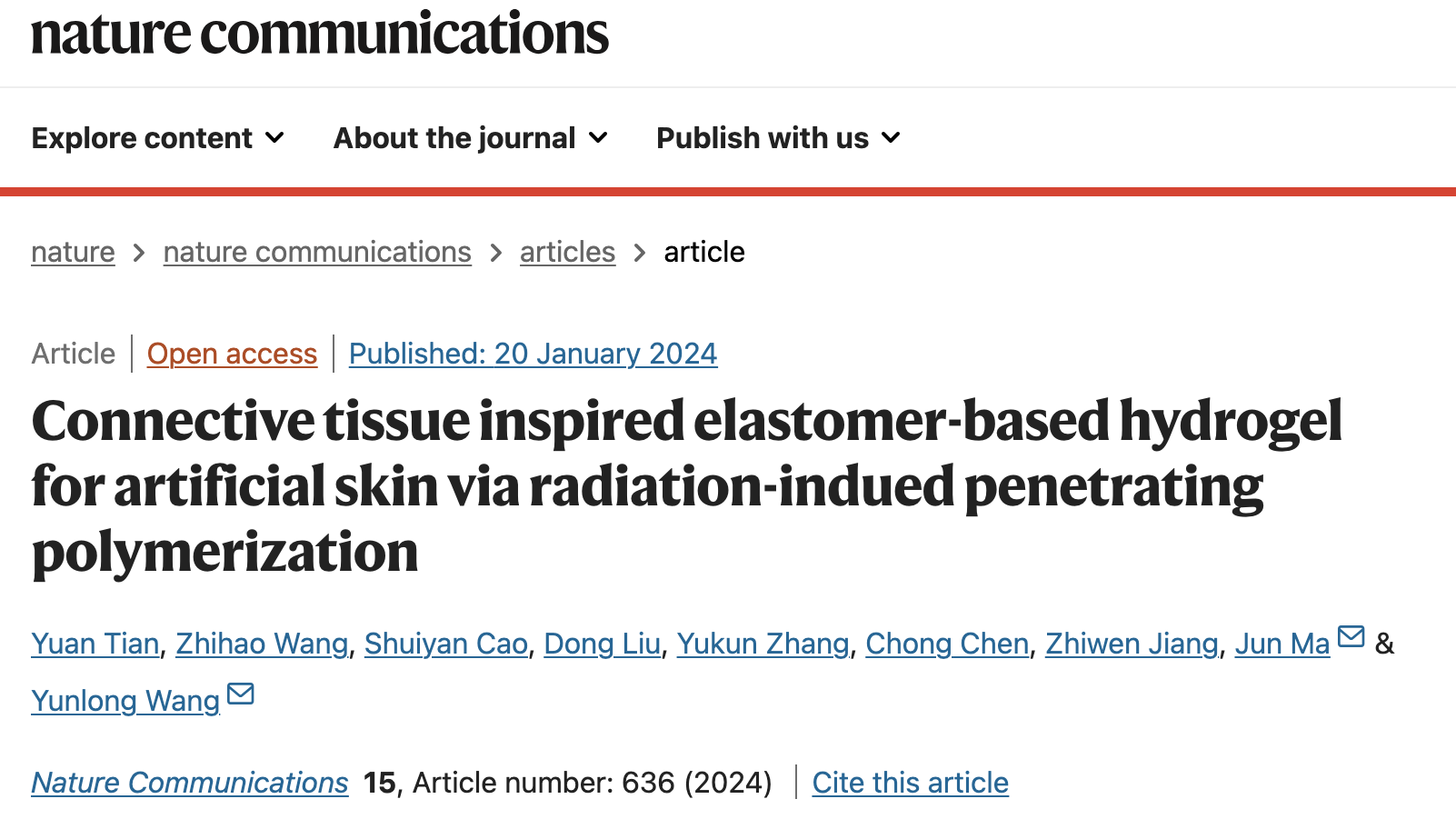 近日,澳门彩票有限公司(中国)官方网站 讲师王运龙博士、中国科学技术大学马骏教授与中国工程物理研究院核物理与化学研究所刘栋研究员合作在Nature Communications期刊发表了一篇题为“Connective Tissue Inspired Elastomer-based Hydrogel for Artificial Skin via Radiation-indued Penetrating Polymerization”的研究论文。