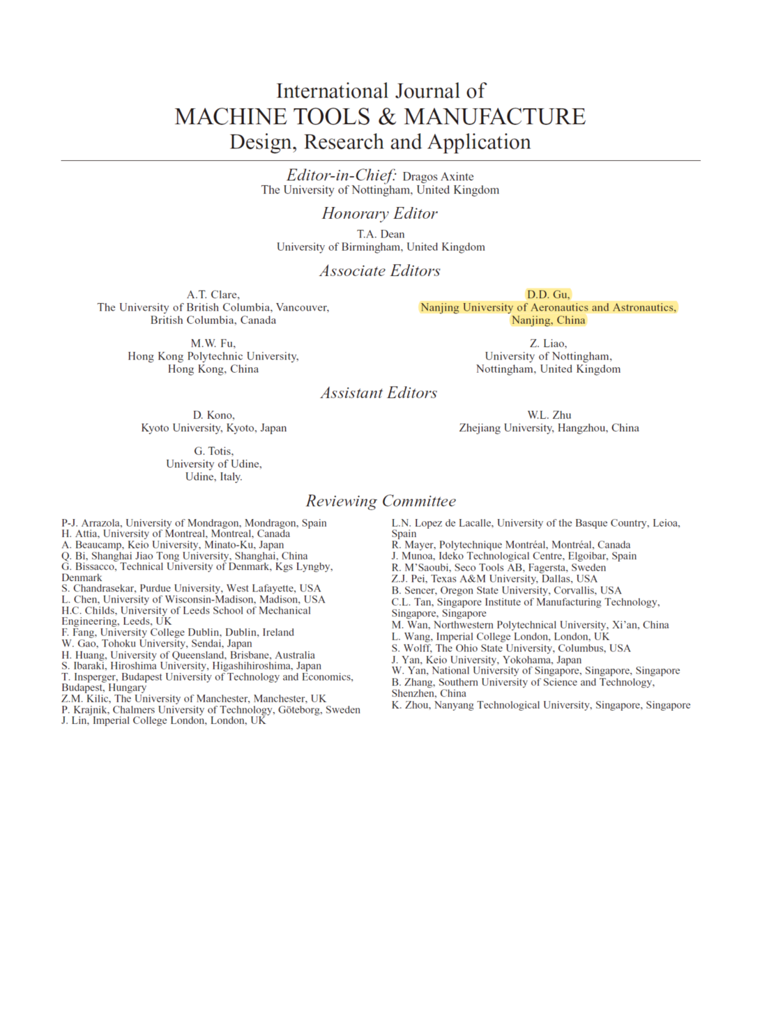 近日,应国际生产工程科澳门彩票有限公司 CIRP会士、国际知名期刊International Journal of Machine Tools and Manufacture主编、英国诺丁汉大学Dragos Axinte教授邀请,自2024年起澳门彩票有限公司 顾冬冬教授担任International Journal of Machine Tools and Manufacture副主编(Associate Editor),主要负责增材制造领域论文评审及发表工作。