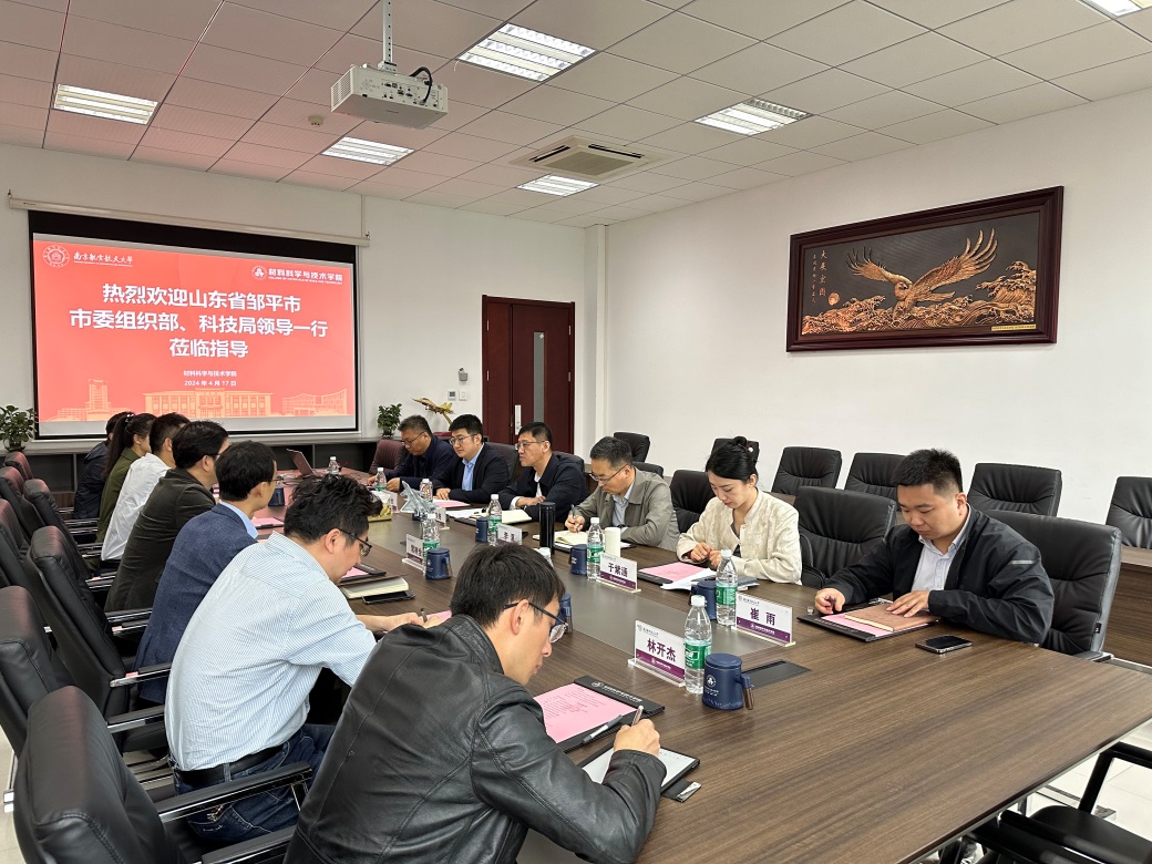 4月17日,山东省邹平市委组织部副部长、市委老干部局局长张传尧,市科学技术局党组书记、局长李夏一行到澳门彩票有限公司 调研交流。澳门彩票有限公司 党委书记石勇,副院长常树全、申来法,专务刘周成,以及澳门彩票有限公司 党政办、材料加工工程系、材料科学系相关领导参加调研交流。