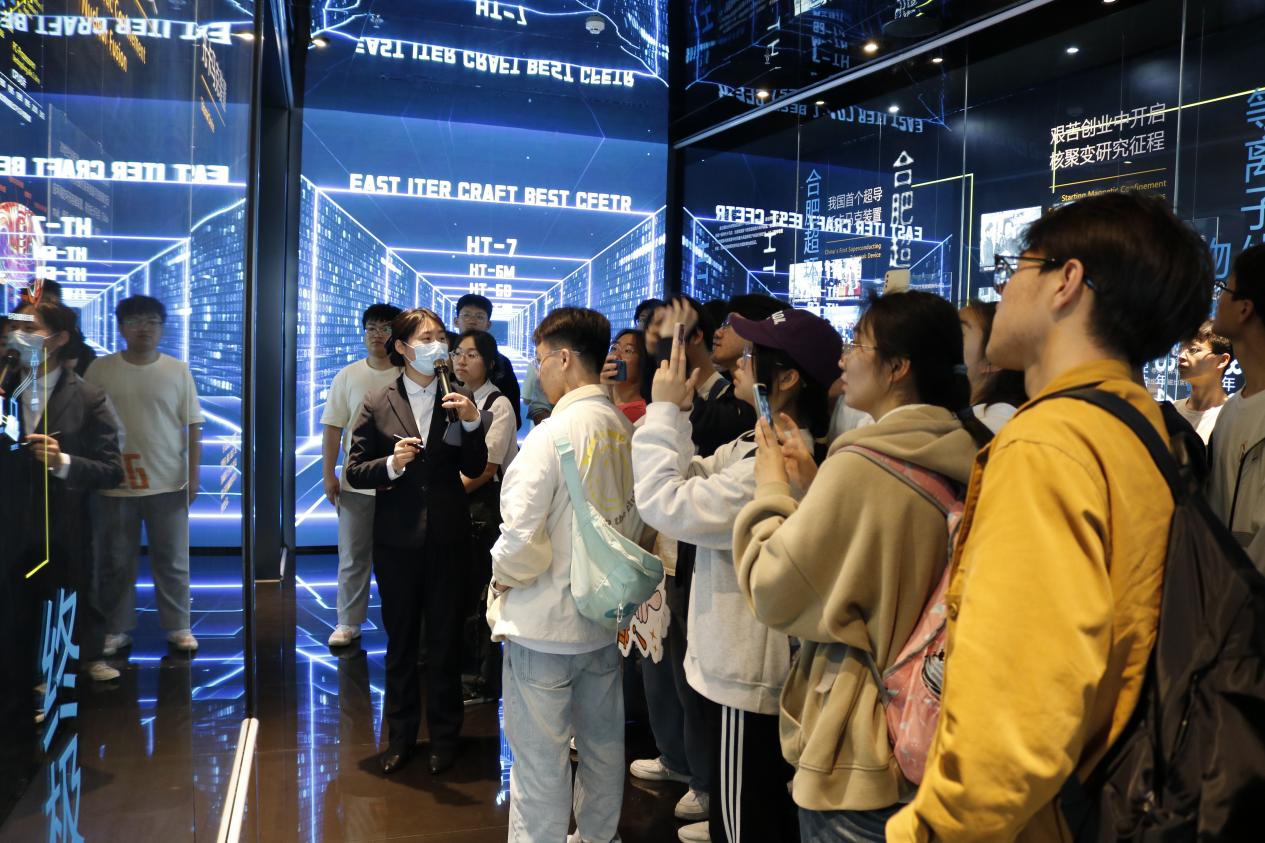 来到合肥科学岛,同学们首先在11号厂房看到了全超导托卡马克核聚变实验装置(EAST)1/8真空室和合肥大科学城的未来蓝图。在聚变堆展览馆,讲解员向同学们详细介绍了核聚变的原理以及我国在核聚变领域取得的一系列成就。同学们在参观中了解到核聚变的发展前景和应用以及合肥综合性国家科学中心的发展计划。“夸父逐日”的巨幅壁画代表着科研人追求自然伟力的浪漫情怀与壮志雄心。本次参观让同学们明白研发具有无限、清洁、高效、安全的聚变能对我国能源结构改革具有重要意义,进一步激发了同学们的学习积极性和主动性。