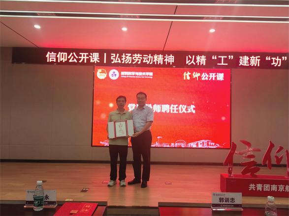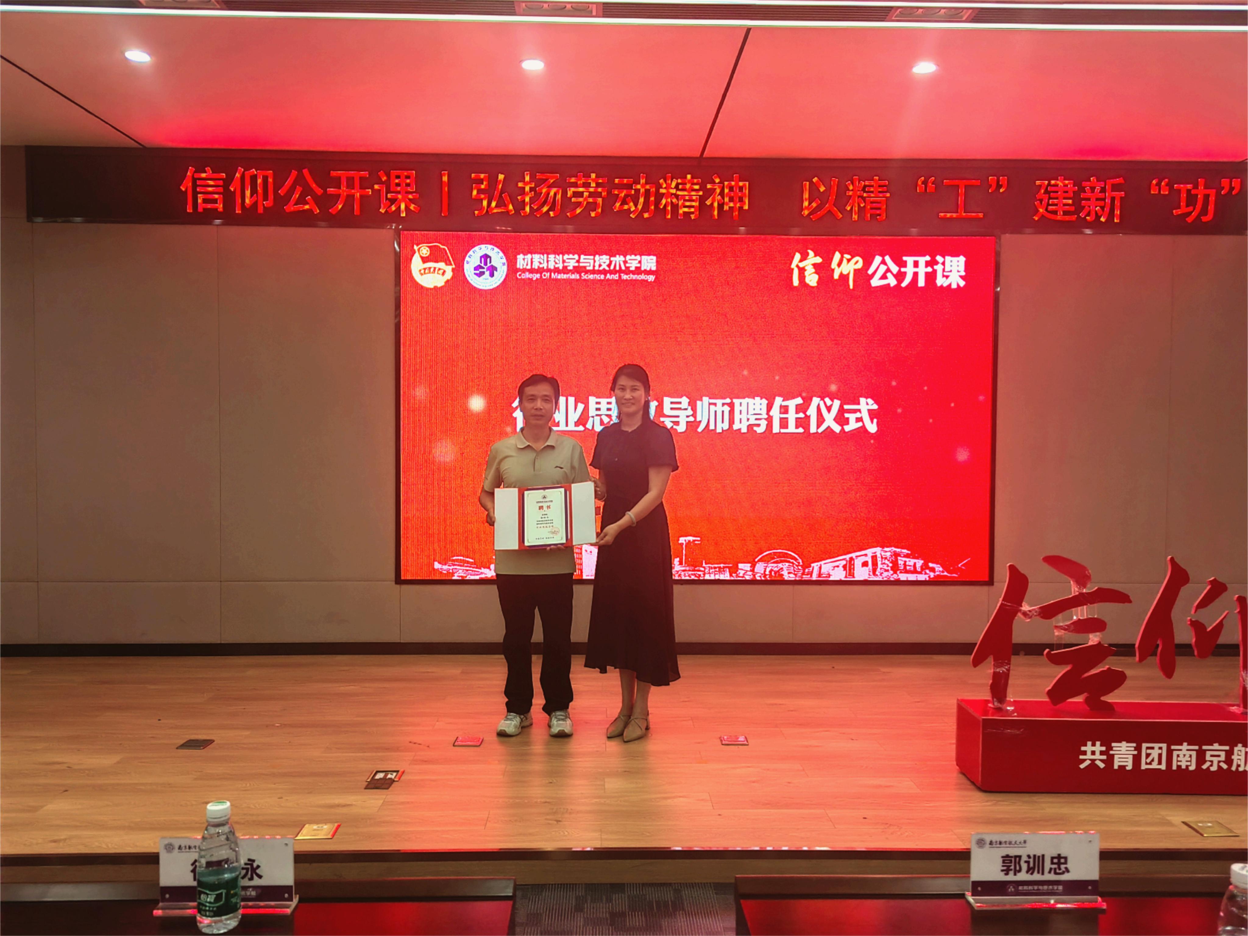 徐树永长期扎根兵器制造一线,肩负为国铸重器的使命任务,心系南航发展和青年学生的成长成才。公开课上,院党委副书记庄晓舒和副院长郭训忠分别为徐树永颁发“澳门彩票有限公司 行业思政导师”“柔性成形技术及装备团队纵向党支部党建导师”聘书。