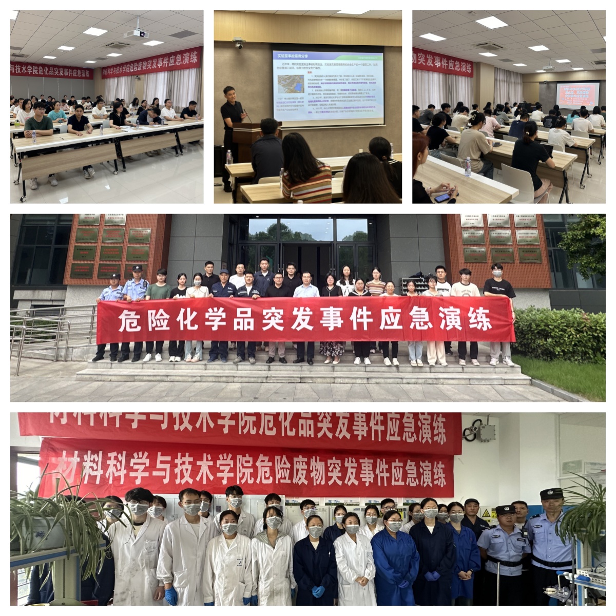 本次演练邀请了江苏省环境资源有限公司专家,针对实验室危险废物的管理现状,从实验室事故案例分析、危险废物管理常见问题、分类管理要求、暂存点管理及突发事件应急处置等多个方面进行了详细讲解和指导。同时指导师生开展危险化学品盗抢和实验室危险废物倾洒泄露两个场景的处置的演练。